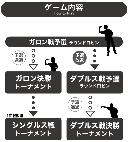 - ダーツプレイヤーとしての品位を損なうような泥酔、罵声、声援等は禁止です。